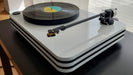 The new R3 is a subchassis drive with sufficient mass to provide a solid acoustic foundation for tonearms of sizes 9 to 12 inches. A special feature here is the rotatable tonearm base, which makes it possible to mount tonearms with a center distance of 200 mm to 300 mm. This can be done easily and quickly by the owner. The arm base is adjusted to the correct distance with the aid of a template. Due to the consistently positive acoustic results of our two models H1 and H2, solid surface material was also chosen as the dominant material for the R3. The two intermediate layers dampen possible external and internal disturbances.